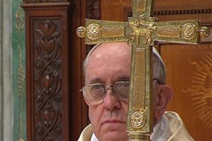 Pope Francis thrilled tens of thousands of people today gathered for his installation Mass,taking a long round-about through St Peter’s Square and getting out of his jeep to bless a disabled man in a wheelchair in the crowd.