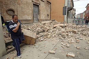Panicked people rushed into the streets when a powerful earthquake struck northern Italy early today,killing three people and injuring at least two others,rescuers said. The 5.9-magnitude quake which struck around 0730 IST in the Emilia-Romagna region and the area around Venice had its epicentre 36 kilometres north of Bologna at a depth of 10 kilometres. It lasted around 20 seconds and was followed by several aftershocks. Earlier another 4.1-magnitude quake was felt in the Lombardy region around Milan,Italy's financial and business capital. Rescue services said the three people died on night shifts in the Modena and Ferrara areas. One man died when the workshop of a plastic-producing factory collapsed near Ferrara and the two others in a ceramics factory. Two people were injured in another region. Several church steeples also partly collapsed and hospitals were evacuated as a precautionary measure.
