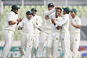 Shahadat Hossain,dropped on five by Abdur Rehman at deep mid-wicket off Ajmal,remained unbeaten on 21 with the help of one six and two fours.