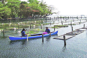 A natural advantage is that the pearl spot fish feeds on algae,which gets clogged in the cage net. But for the fish feeding on the algal growth,the cages need not to be cleared periodically to ensure that natural water flow is not blocked.