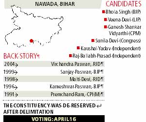 Twenty-one candidates are in the fray in Nawada. The main contest is between Veena Devi,wife of convicted LJP politician Surajbhan,and Bhola Singh,the BJP candidate who is a minister in the Nitish Kumar Government. Apart from these two,theres also Sunila Devi of the Congress,CPI(M)s Ganesh Shankar Vidhyarthi and two influential Independents,Raj