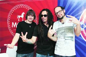 Doubts allayed,our attention turned to the band in question vocalist Johnathan Davis,guitarist James Shaffer (known as Munky due to his dexterous fingers) and drummer Ray Luzier looked relaxed and prepared for the gig,which takes place this evening. The bands fourth member,bassist Reginald Fieldy Arvizu,was en route from the US at that time.