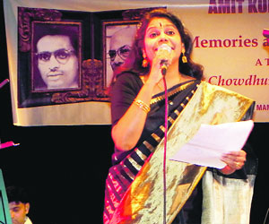 The final song renderings came from Salil Chowdhurys daughter Antara who is almost a mandatory performer for every Amit Kumar Fan Club musical evenings. Among the six songs she dedicated to the memory of her father and his friend Sudhin Dasgupta,mention must be made of the unforgettable numbers Kon she alor shwapno niye originally sung by Asha Bhosle for the film Picnic,Keno kicchu kotha bolona,a non-film number to which Lata Mangeshkar had lent her voice,and Hemant Kumars famous non-film number Kono ek gaanyer bodhur whose lyrics and music both were by Salil Chowdhury.