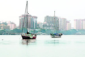 Do you define a city by its sights? Then here is one. At 7.30 in the evening,on one end of Kochi,a gigantic Chinese fishing net is lowered into jade-green waters that noisily splash against the coast. Huge boulders hanging from ropes on one side of a wooden cantilever are slowly released. A fisherman steps on a wooden plank jutting into the sea and walks forward,balancing what looks like a medieval torture device,and the net sinks,while a single naked bulb hangs over the water,luring in some silver sardines,mackerel and a few squiggles of shrimp. And here is another. A few kilometres away,a trio of luxury yachts that have gambolled down the Arabian Sea are wallowing in the still night,as a marina,Indias first,comes up on the Bolghatty Island. This is Kochi at its contrarian best.