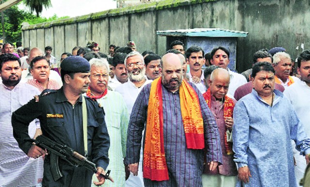 Amit Shah,BJP general secretary in charge of Uttar Pradesh and a close aide of Gujarat Chief Minister Narendra Modi,raked up the Ram temple issue during a visit to Ayodhya on Saturday. Shah,who visited the makeshift Ram temple at the disputed site,said: I came to visit the Ram temple which is a centre of faith for crores of Hindus from around the world. I have prayed that good governance is established in the country and the nation gets rid of the Congress. I have also prayed that we together build a grand Ram temple here as soon as possible and restore Lord Ram to his rightful place. This was Shahs first official visit to Ayodhya after being appointed in-charge of UP. He later attended a party meeting which was held in the Karsevakpuram area. BJP sources said the meeting venue was chosen to send a message to the cadres on the Ram temple issue.