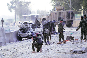 A suicide car bomber killed nine people in an attack on a military airport in eastern Afghanistan on Monday,officials said,the latest bloodshed since copies of the Quran were burned at a NATO base last week. The Taliban claimed responsibility for the attack as revenge for the Quran burnings. Nineteen Afghan civilians and law enforcement officers and four NATO soldiers were wounded in the blast,a spokesman for the NATO-led International Security Assistance Force (ISAF) in Nangarhar province,of which Jalalabad is the capital,said. Jalalabad airport is almost exclusively used by NATO and the US military. Anti-Western fury has deepened significantly since the desecration of the Muslim holy book at the main NATO Bagram air base in Afghanistan. NATO described the incident as a tragic blunder. The US Embassy warned of a heightened threat to American citizens in Afghanistan and many Westerners are on lock down,meaning they are not allowed out of their fortified compounds. Riots have raged across Afghanistan over the past week despite widespread apologies from US leaders,including President Barack Obama and military commanders. Seven US military trainers were wounded on Sunday when a grenade was thrown at their base in Afghanistans north. Chants of Death to America! have come to characterise the protests and some demonstrators have hoisted the white Taliban flag. With few signs of the crisis abating,the US ambassador said the United States should resist the urge to pull troops out of Afghanistan ahead of schedule. Tensions are running very high here. I think we need to let things calm down,return to a more normal atmosphere,and then get on with business, Ambassador Ryan Crocker told CNN. This is not the time to decide that we are done here. We have got to redouble our efforts. Weve got to create a situation that al-Qaeda is not coming back, he said. Under an international agreement,foreign combat forces are due to leave Afghanistan by the end of 2014,a process which is already under way. The groundswell of anger over the burning of the Quran has highlighted the challenges ahead as Western forces try to quell violence and bring about some form of reconciliation with the Taliban. The violence has killed more than 30 people and wounded at least 200,including two US troops shot dead by an Afghan soldier who joined rallies in the east. Two US officers were also shot at close range inside the Interior Ministry. In an interview from Rabat,US Secretary of State Hillary Clinton said the violence was out of hand and it needs to stop.