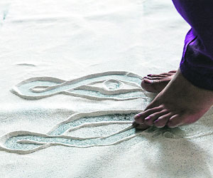 A black 10ft by 10ft sheet,covered in white flour,is her stage and her canvas,and in a span of five minutes,she covers it with the figure of a majestic feline: a folk-cave art-style lion with a full mane and rounded eyes which looks just like the one from Vijays YouTube video.