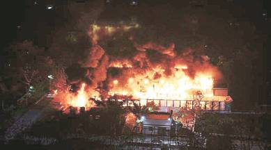 The fire was first noticed in stacks of hay piled on a plot adjacent to the three-storeyed building, housing the