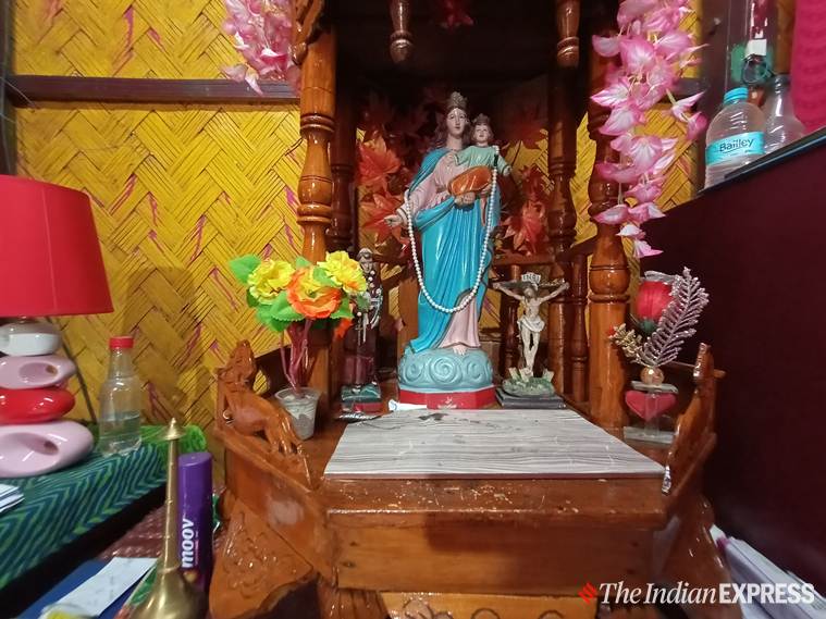 A shot of statues of Mother Mary and Jesus at the house of Jarath Lagardo, one of the community elders, who is now ill. The picture shows cultural semblance as Jesus and Mary have found their place on a Hindu ‘asana’, which is used as an altar. (Express photo: Debraj Deb)