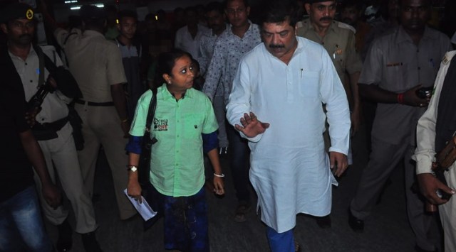 Tripura Health Minister Sudip Roy Barman with a childline worker at Agartala railway station. (Express photo by Debraj Deb)