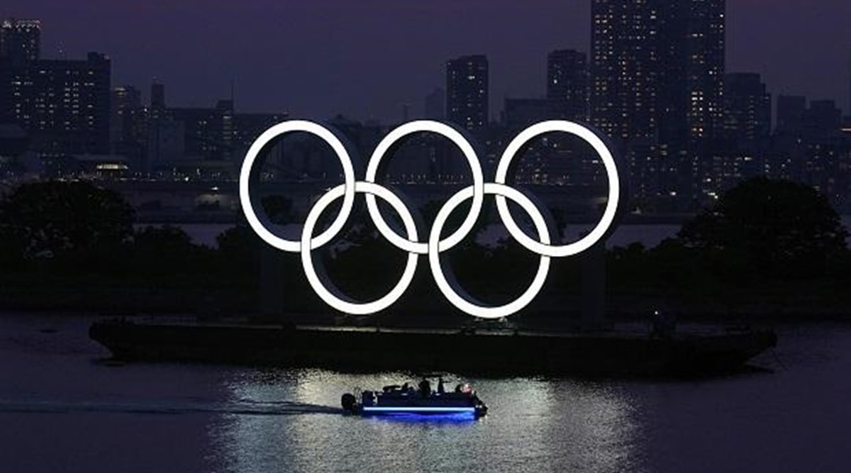 The Olympic rings float in the water at sunset in the Odaiba section of Wednesday, June 3, 2020, in Tokyo. (AP)