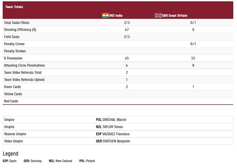 Green card for Rupinder Pal Singh (IND) and another Green card for Liam Ansell (GBR). That means GBR are down to 10 men for the next 2 minutes.