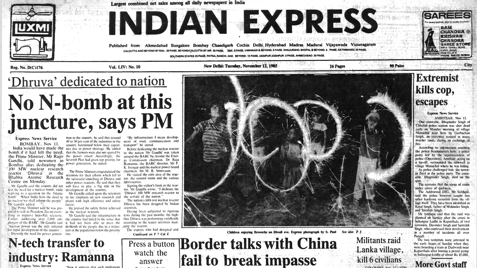 This is the front page of The Indian Express published on November 12, 1985. There was no edition on November 13, 1985 on account of Diwali. The Prime Minister, Rajiv Gandhi, congratulated the scientists for their efforts which led to the successful launching of Dhruva and other power reactors. He called upon the scientists to lay emphasis on new research and plants with high efficiency and safety factors. He praised the safety factor achieved in the nuclear reactors.
