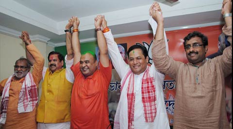 BJP chief ministerial candidate Sarbananda Sonowal along with Senior BJP leaders Ram Madhav (R) and Himanta Biswa Sarma celebrating the party’s thumping win the Assam Assembly polls, BJP Party head office in Guwahati on Thursday. (Source: PTI)