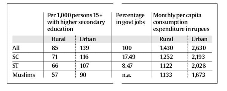 Economic justice is an offspring of social justice. The neglected and disadvantaged groups have lower educational attainments, less property, fewer government or quality jobs and lower incomes/expenditure, as the numbers in the table illustrate:
