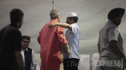 Delhi CM Arvind Kejriwal and L-G Najeeb Jung share a hug. Express Photo