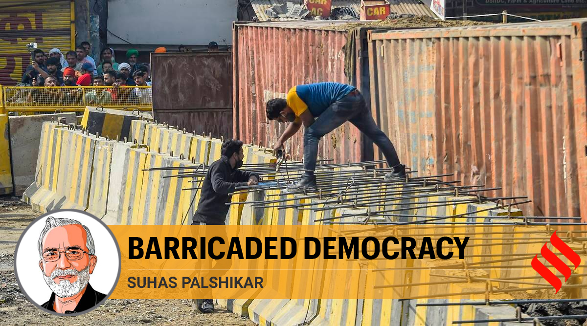 Barricades being set up as part of security enhancements by the police near the site of farmers' ongoing protest against farm reform laws, at Singhu Border in New Delhi, Monday. (PTI) As the farmers’ agitation continues along with the government’s effort to convert it into an opportunity for repression, we might be witnessing something bigger than meets the eye. There are conflicting messages emanating from the developments and even as one may be awed by the grit of the agitating farmers, signs of cunning of the state are on display. More than two months after the agitation began, it is increasingly clear that the government is bent on both maligning the agitation and, more generally, delegitimising the idea of protest and popular agency.