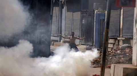 A demonstrator shouts slogans amid smoke from a tear gas shell fired by the Indian police during a protest against the recent killings in Kashmir region, in Srinagar, India September 9, 2016. REUTERS/Danish Ismail