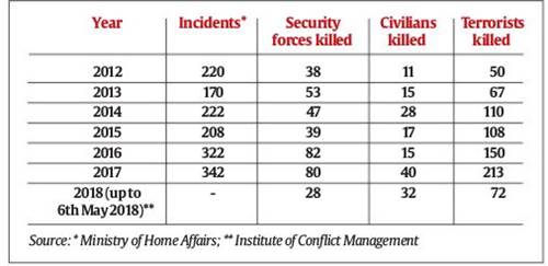 6. The king will never raise the sword against his own people. With great sorrow, it must be admitted that there is an undeclared internal war in the Kashmir Valley. The muscular, militaristic approach to quell dissent (including stone-pelting) has pushed the Valley to the brink of disaster. Violence and death are on the rise (see table). The PDP-BJP coalition government lacks even a shred of legitimacy, yet the Chief Minister, Ms Mehbooba Mufti, will not end the farce that is becoming a tragedy.