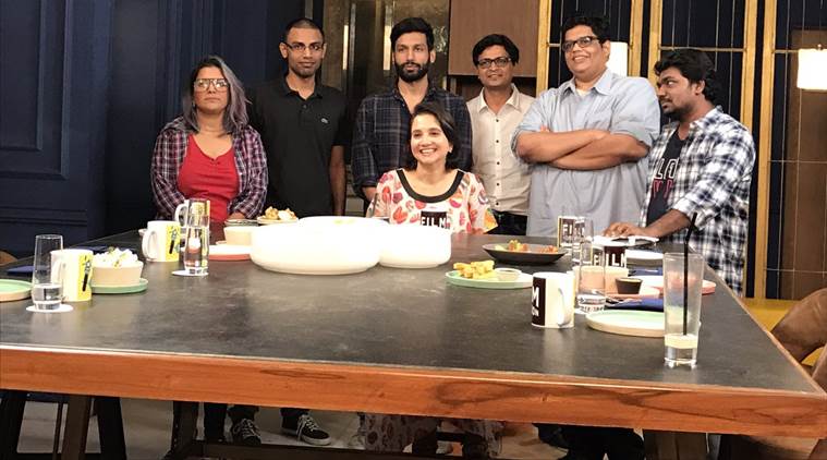 Anupama Chopra (sitting) with Aditi Mittal (far left), Tanmay Bhat, Kanan Gill, Biswa Kalyan Rath, Vipul Goyal and Zakir Khan