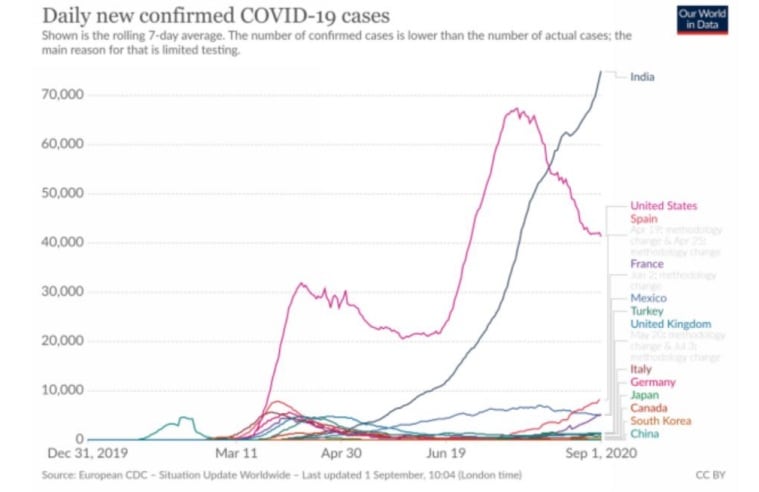 On September 1, the seven-day moving average of daily reported COVID-19 cases in India was 74,835 — the highest in the world. The second and third-highest were the United States and Brazil at 41,443 and 40,773, respectively, far behind India.
