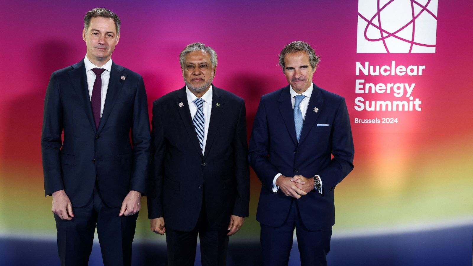 Belgium's Prime Minister Alexander De Croo, International Atomic Energy Agency (IAEA) Director General Rafael Mariano Grossi and Pakistan's Foreign Minister Ishaq Dar attend the IAEA Nuclear Energy Summit in Brussels, Belgium, March 21, 2024. (Reuters)