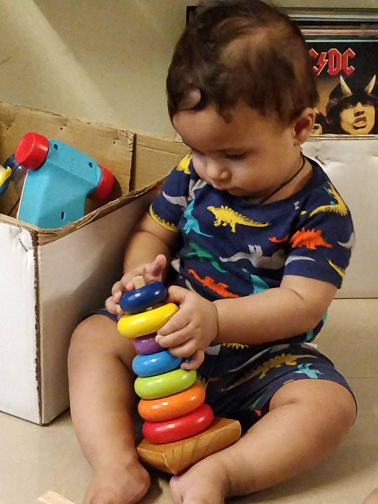 This is when some serious development starts happening. They decide what they want to do and go about doing it. This is when he started figuring out how to stack rings on the pole. Or putting a block on top of other blocks. He’s also figured out how to open remotes of all our appliances and take out the batteries. The kid loves his batteries. I will never figure out why, but batteries are his jam! He will try to open toys that don’t even have batteries to look for them. It is truly adorable and fun.