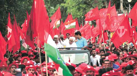 Three tableaux, each in favour of a candidate, led the procession of thousands. CPM workers in red caps carried the party flag chanting slogans against the present disposition. Congress members too joined the procession at various stages, and tied Congress flags to the tableaux.