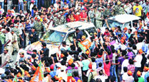 Moving in a convoy that crawled through the city also filled with several companies of paramilitary forces, Modi waved at slogan-shouting supporters from inside his bullet-proof vehicle.