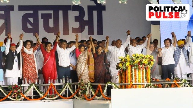 Despite calls for unity in the run-up to the event, the leaders of different parties presented their agenda from the stage. While Congress president Mallikarjun Kharge and party leader Rahul Gandhi targeted the Modi government for freezing the Congress’s bank accounts and accused the Narendra Modi government of trying to fix the election in the BJP’s favour, their Bihar ally Tejashwi Yadav claimed that his government with the JD(U) — now in the NDA — Congress, and Left parties had generated five lakh jobs in 17 months.