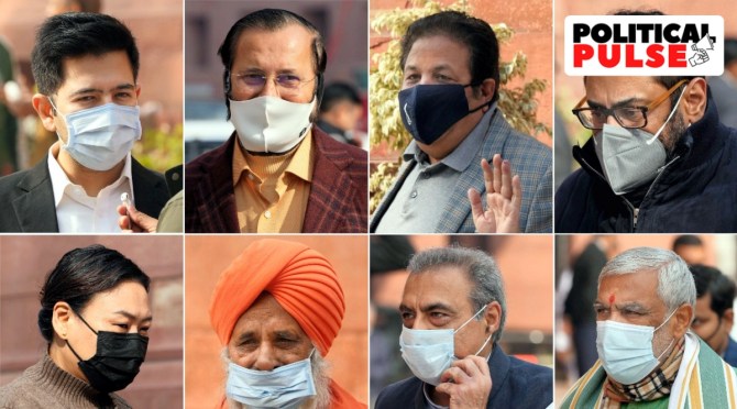 (From left, top row) AAP MP Raghav Chadha, BJP MP Prakash Javadekar, Congress MP Rajeev Shukla, Union Minister Rajeev Chandrasekhar; and (from left, bottom row) BJP MP S Phangnon Konyak, AAP MP Balbir Singh Seechewal, BJP MP Mahesh Jethmalani, and Union Minister Ashwini Kumar Choubey wear a face mask in Parliament Thursday. (PTI Photo)