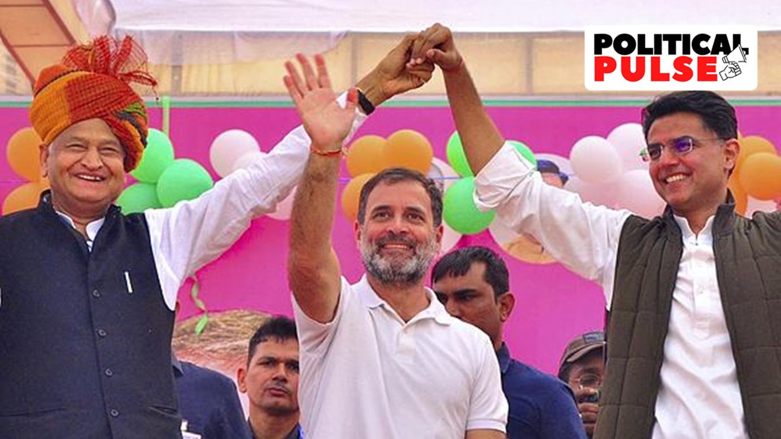 Congress leader Rahul Gandhi with Rajasthan Chief Minister Ashok Gehlot and party leader Sachin Pilot during 'Congress Guarantee Rally' ahead of the State Assembly elections, at Taranagar in Churu district. (PTI)