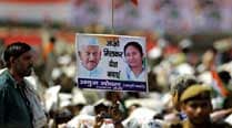 A supporter holds a placard with portraits of Mamata Banerjee and social activist Anna Hazare during an election rally addressed by Banerjee in New Delhi. (PTI)