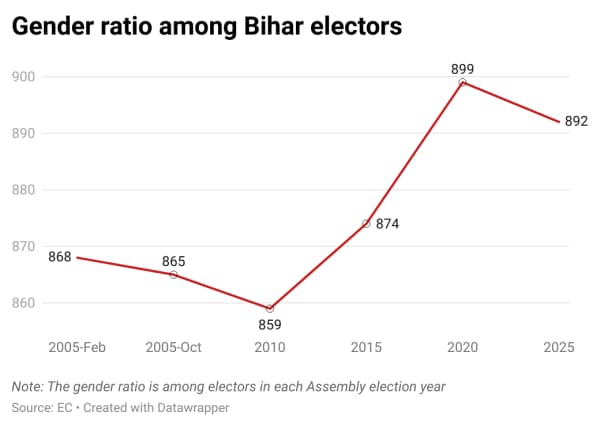 In other words, the women-to-men ratio among voters in Bihar is now 892:1,000. In the last Assembly elections, in 2020, there were 899 women voters for every 1,000 men voters.