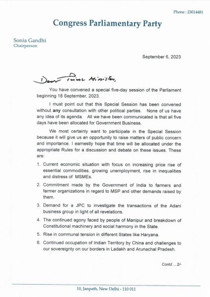 CONGRESS Parliamentary Party chairperson Sonia Gandhi wrote to Prime Minister Narendra Modi on Wednesday over the Parliament special session called on September 18, flagging nine issues which her party wanted discussed in the House, including the Chinese incursion in Ladakh, Manipur violence, price rise and the allegations against the Adani Group.