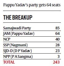The Samajwadi Party, which quit the grand alliance in Bihar after being offered only five seats, will now contest 85 seats, the lion’s share in the Samajwadi Secular Front (SSF) of six parties. Pappu Yadav’s party gets the second highest share with 64 seats.