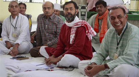 AAP’s expelled leaders Yogendra Yadav, Prashant Bhushan, Professor Anand Kumar and others at the first meeting of National Steering Committee in flagship of Swaraj Abhiyan in Gurgaon on Wednesday. (Source: PTI)