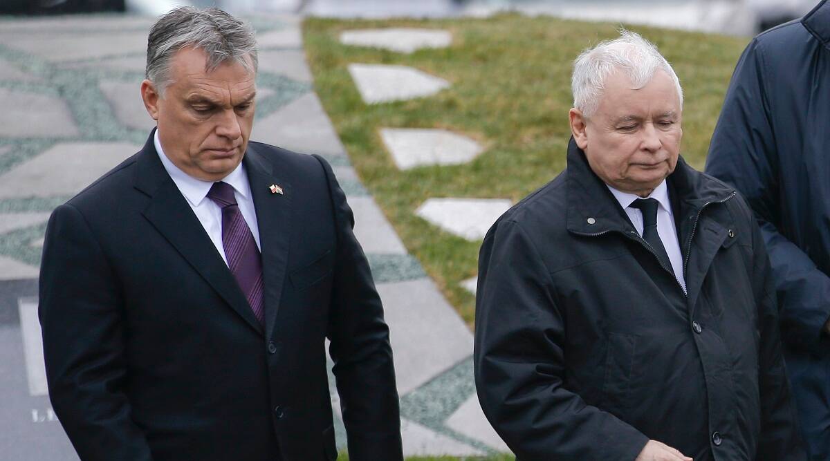 File photo of Hungarian Prime Minister Viktor Orban, left, with Jaroslaw Kaczynski, the leader of Poland’s ruling party, during the inauguration of a memorial for the Smolensk plane crash, in Budapest. (AP Photo)