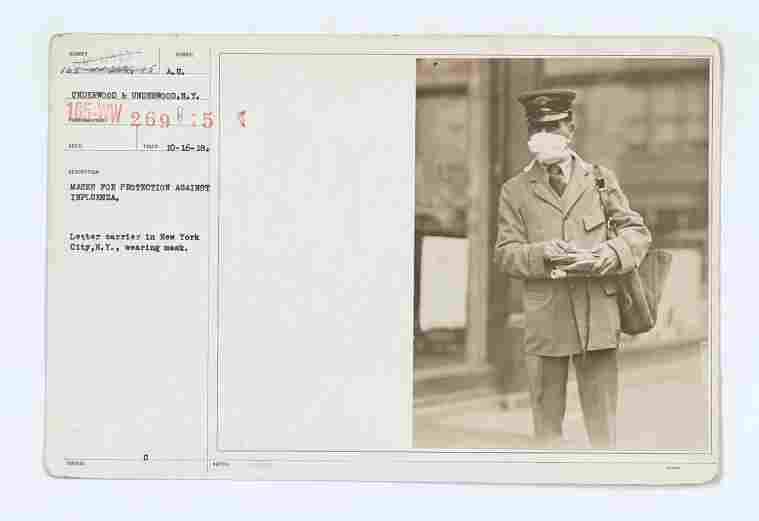 Letter carrier in New York city wearing a mask during the flu. (Source: Wikimedia Commons)