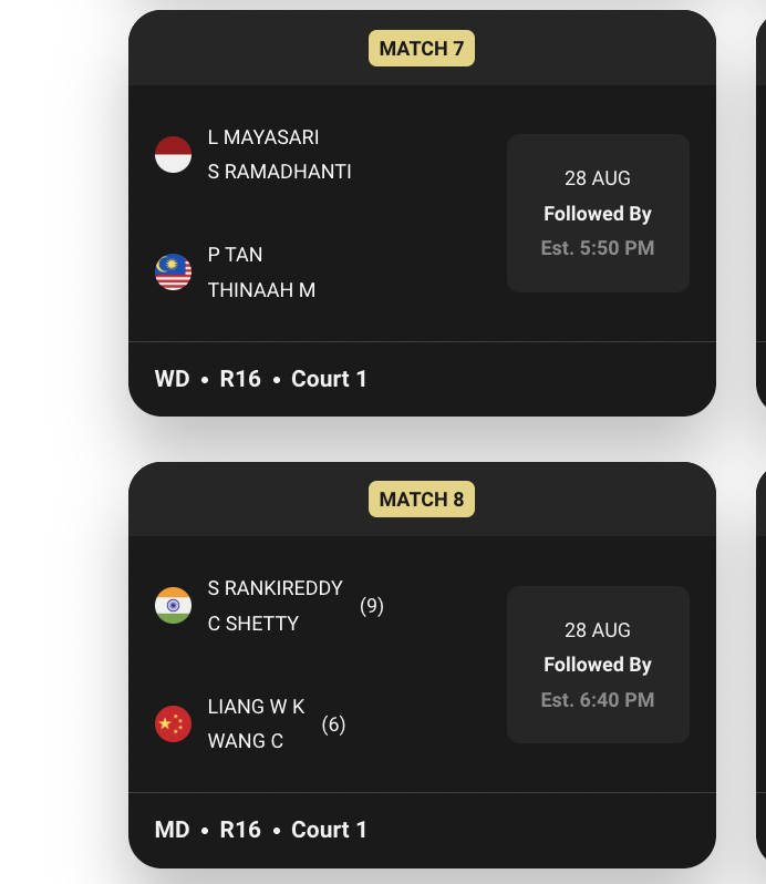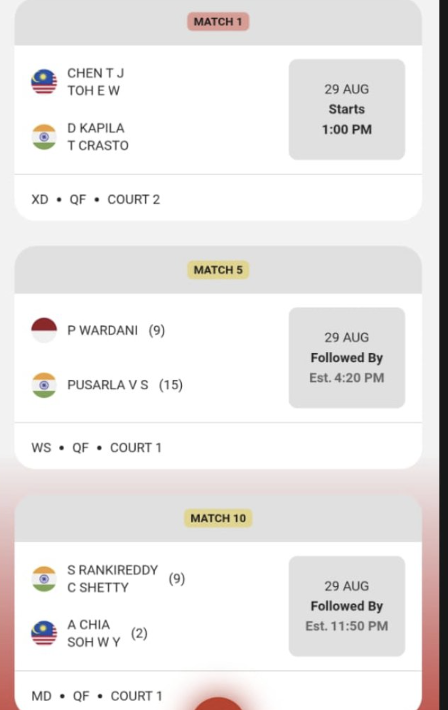 Satwik-Chirag will be on court after the upcoming women's doubles match.