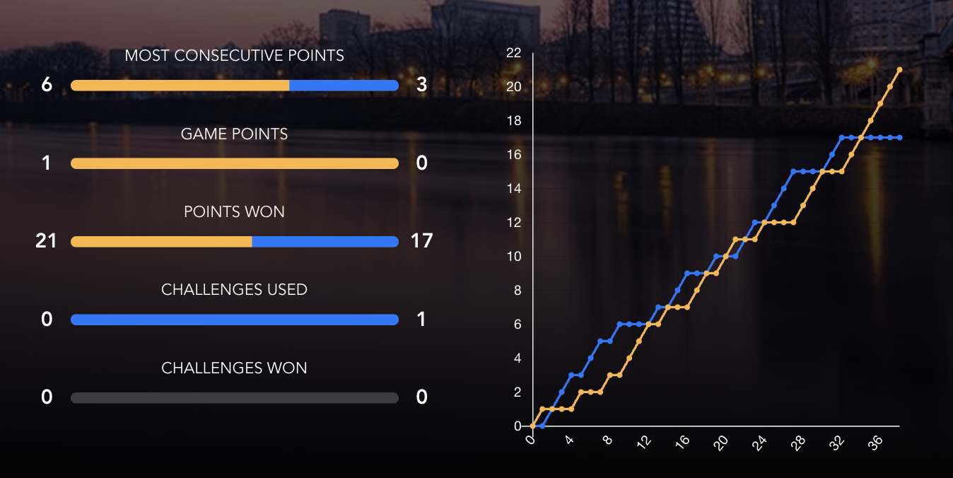 A sensational flat rally follows with four players going at each other crosscourt and the Indians stay their ground at midcourt to take that point for a 8-6 lead.