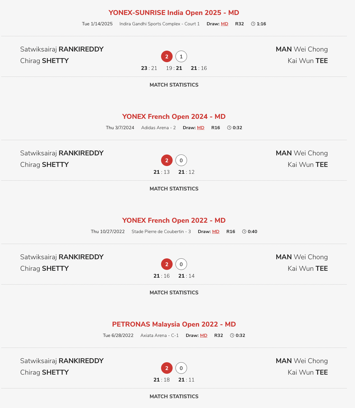 Satwik-Chirag have never lost in their four meetings against Man-Tee of Malaysia. In fact, the first three wins were all in straight games. But earlier this year at the India Open, the Malaysians troubled the Indians in what a closely-fought three-game battle.