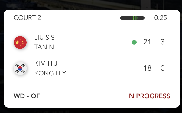After her superb run last week in Singapore, where she beat An Se Young on her way to the title, Chen Yufei has withdrawm from her quarterfinal today due to an injury. This also means Satwik-Chirag match will start a bit earlier than scheduled, right after the ongoing Women's Doubles match (which could actually be a marathon in itself)
