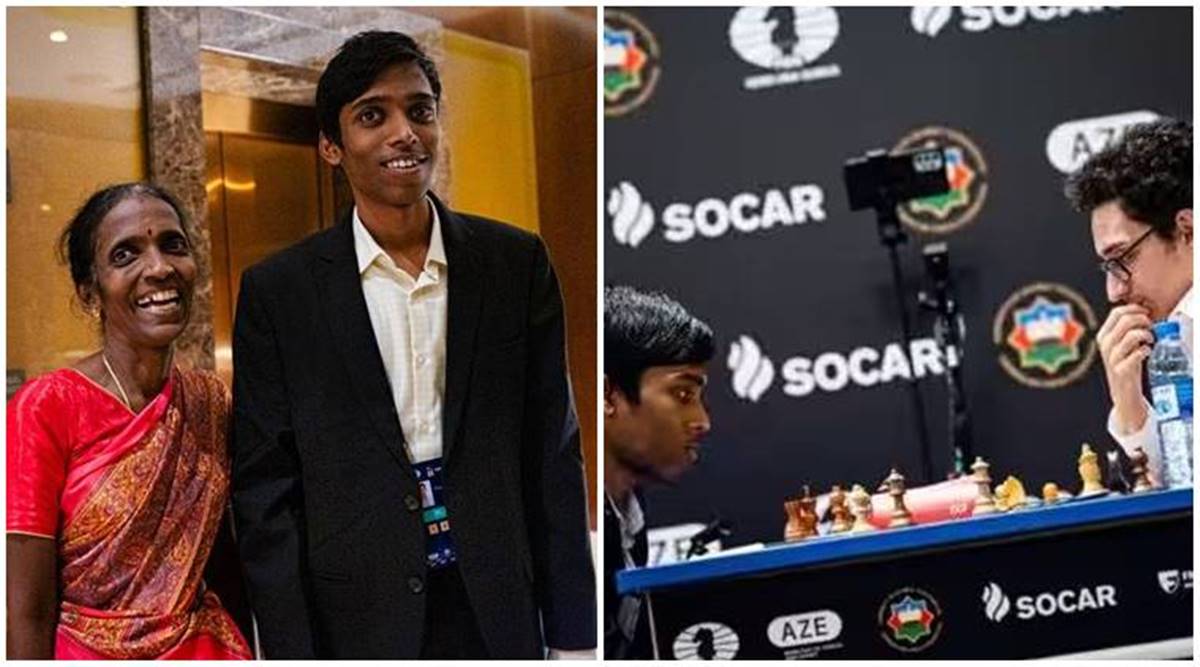 Praggnanandhaa and his mother on the right. Praggnanandhaa against American player Fabiano Caruana on the left. (Source: X/@photochess/FIDE/Stev Bonhage)