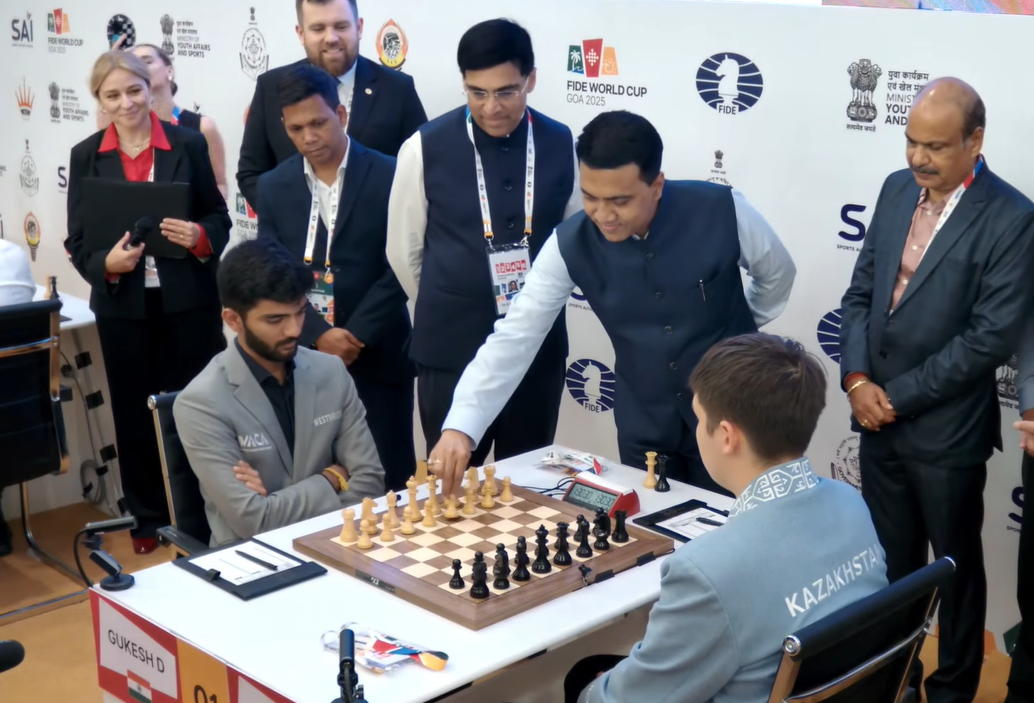 The battle between World Champion D. Gukesh and 2024 Junior World Champion Kazybek Nogerbek has begun, with Goa CM Pramod Sawant making the first ceremonial move. And with that, we are underway for the second round.