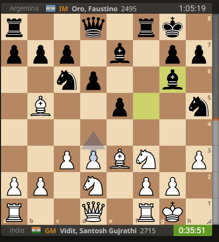 Vidit has white pieces but already is looking under some pressure as he is down to 35 minutes after just 11 moves. Oro, meanwilhe, has more than an hour.