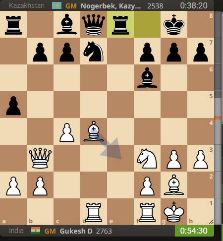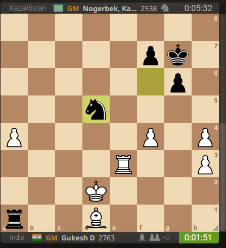 The tables have turned in Gukesh's game. It's him who is playing with very little time on the clock; his advantage has also fizzled out, and he needs to make sure he does not give any outside chance to Nogerbek.