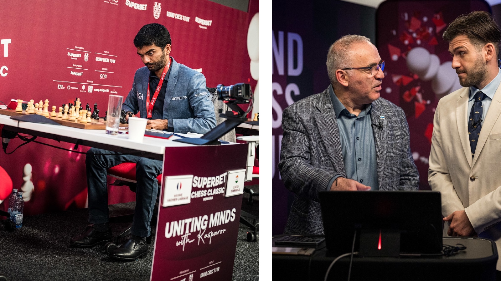 (LEFT) Gukesh plays at the Bucharest event of the Grand Chess Tour; (RIGHT) Cristian Chirila talks to Garry Kasparov. (PHOTOs: Lennart Ootes via Grand Chess Tour)