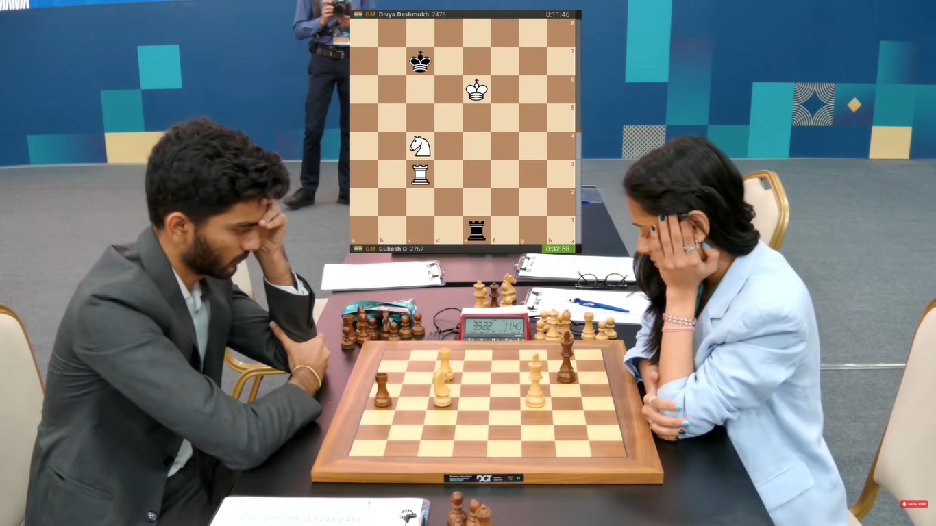 It would not have been easy to grind out a victory for the world champion since Divya, the reigning FIDE Women's World Cup winner, also had a rook on the board to defend against Gukesh's checkmating attempts.