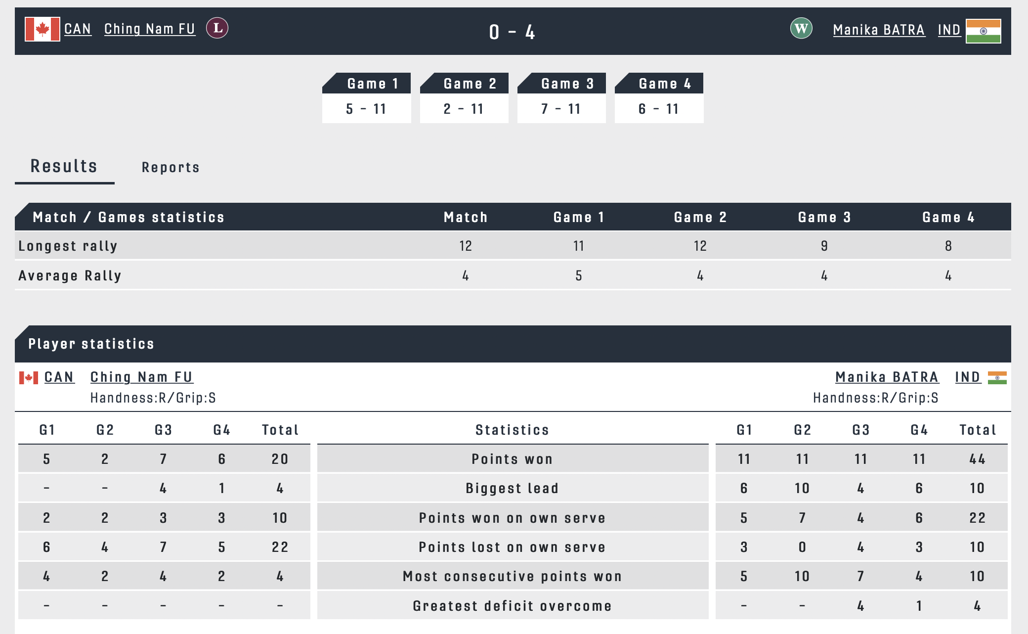 Manika Batra wins 4-0 Ching Nam Fu. A comfortable outing for the defending champ by 11-5, 11-2, 11-7, 11-6.